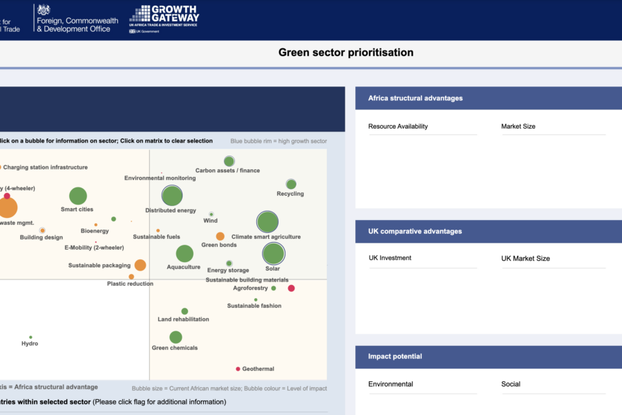 This dashboard highlights priority green sectors across African countries, showcasing top investment opportunities, readiness levels, and success stories to guide UK-Africa trade and collaboration.